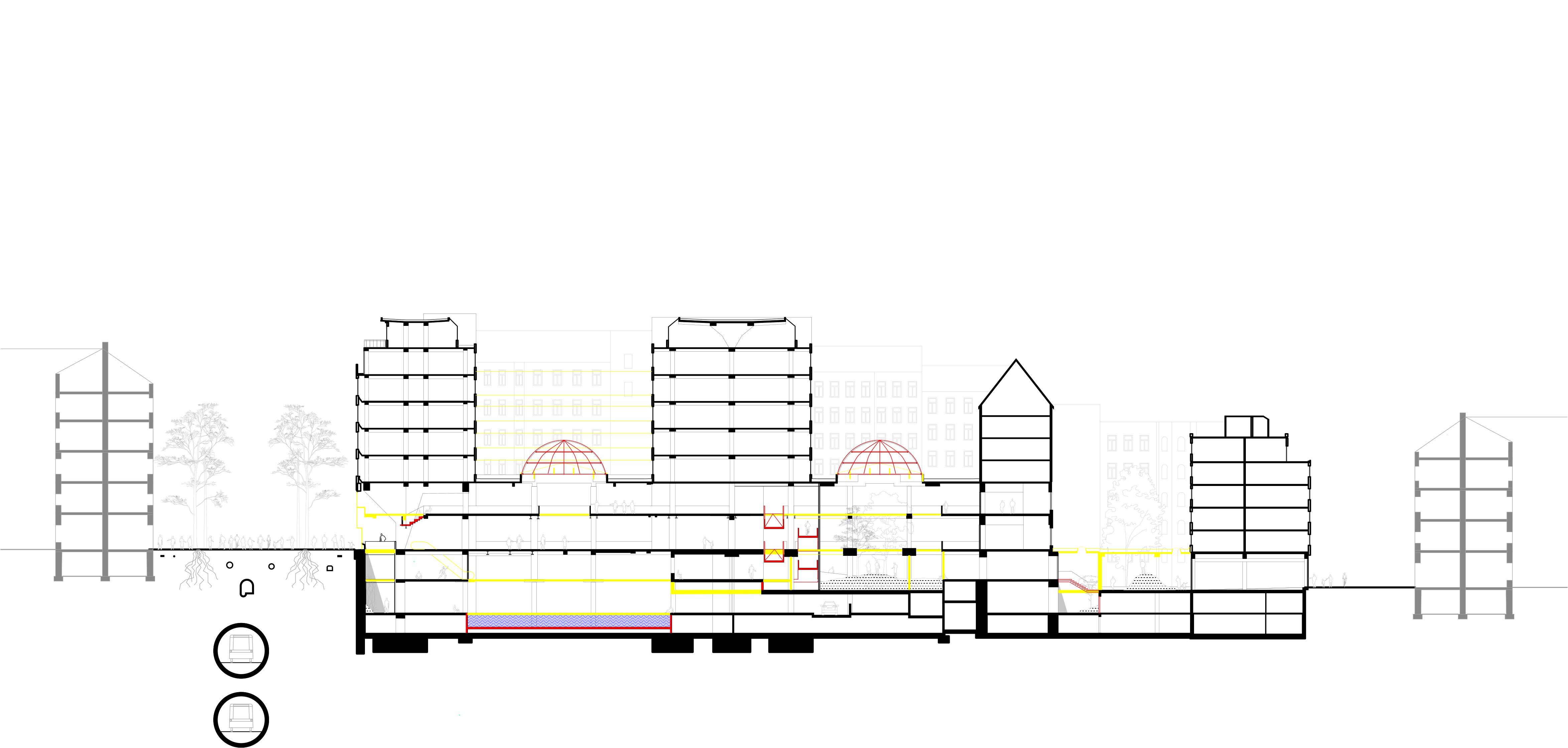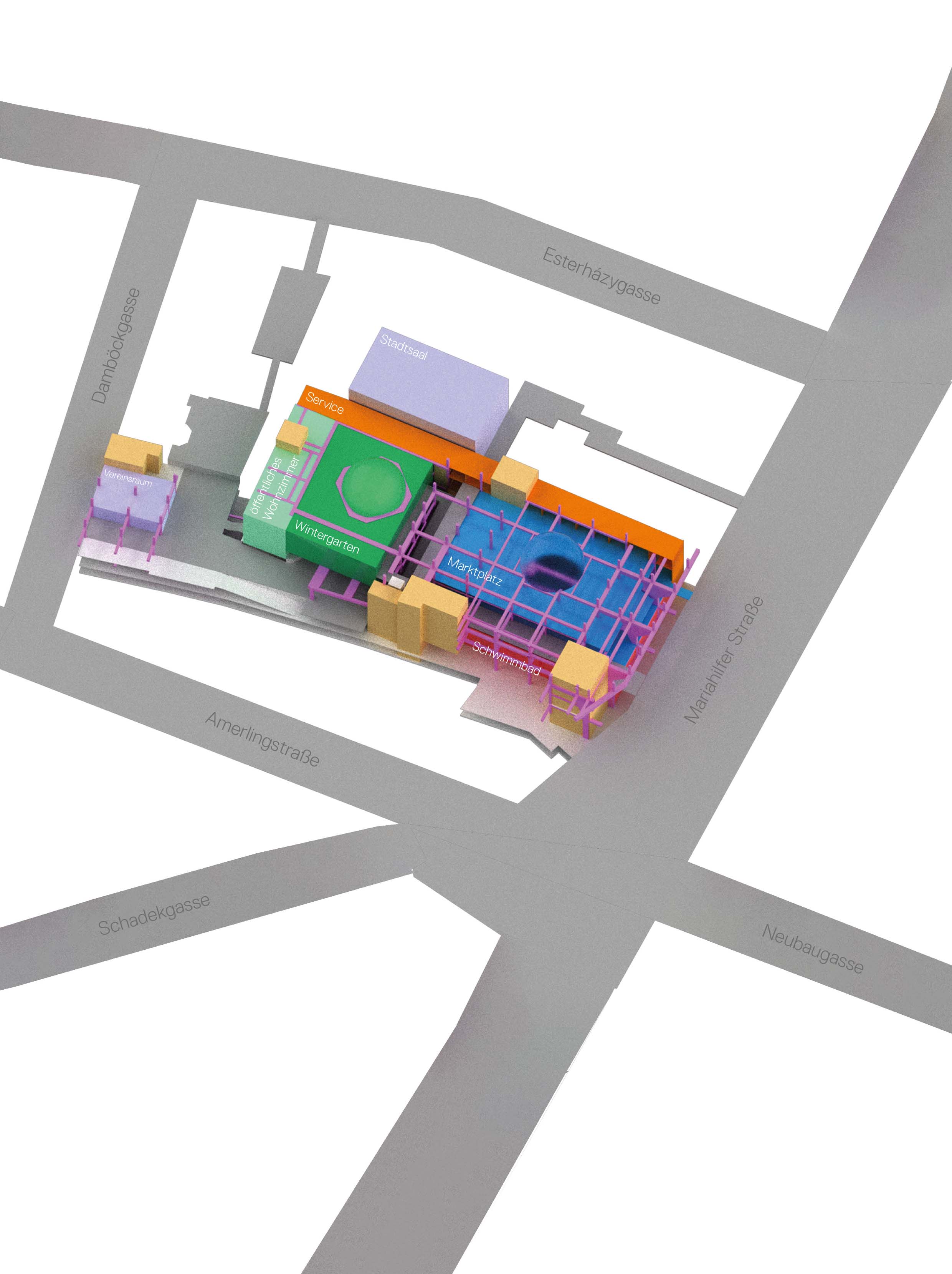 Mit bis zu 70.000 Passant_innen pro Tag ist die Mariahilfer Straße die meistbesuchte Einkaufsstraße Wiens. Um 1900 entstanden hier die großen Warenhäuser – Gerngross, Herzmansky, Esders und das Kollektivkaufhaus Mariahilfer Zentralpalast. 1974 eröffnete mit dem Generali Center die erste Wiener Shoppingmall, und 2015 wurde die Mariahilfer Straße durch den Umbau zur Fußgängerzone selbst zu einer Mall.Heute rütteln Onlinehandel, steigende Mieten und ein sich wandelndes Konsumverhalten am Konzept des stationären Einzelhandels. Monofunktionale Kaufhäuser sind vom Zerfall bedroht, und nach Jahrzehnten des Wachstums ergeben sich somit als nahes Zukunftsszenario Lücken im städtischen Gefüge. Während andere Einkaufshäuser an der Mariahilfer Straße schon im Prozess des Flächenrückbaus sind, hat das Generali Center mit seinem letzten Umbau 2016 sein Maximum an Flächenausnutzung erreicht.In dieser Arbeit wird die ehemalige Shoppingmall zum Flagship einer neuen Typologie: ein Haus als soziale Infrastruktur, das öffentliches Programm anbietet und neue Verbindungen in den Stadtraum schafft. Durch den Rückbau werden räumliche Ressourcen freigesetzt, die kleinteilige Strukturen im dicht verbauten Stadtgebiet nicht bereitstellen können. Sport, Kultur, Bildung, Nahversorgung und Soziales verdichten sich hier zu einem hybriden Baustein – ein Haus für alle als Zeichen einer Stadtgemeinschaft jenseits von Konsum und maximaler Rendite.Alle hier hochgeladenen Inhalte sind das eigene Werk der Absolventin oder des Absolventen.