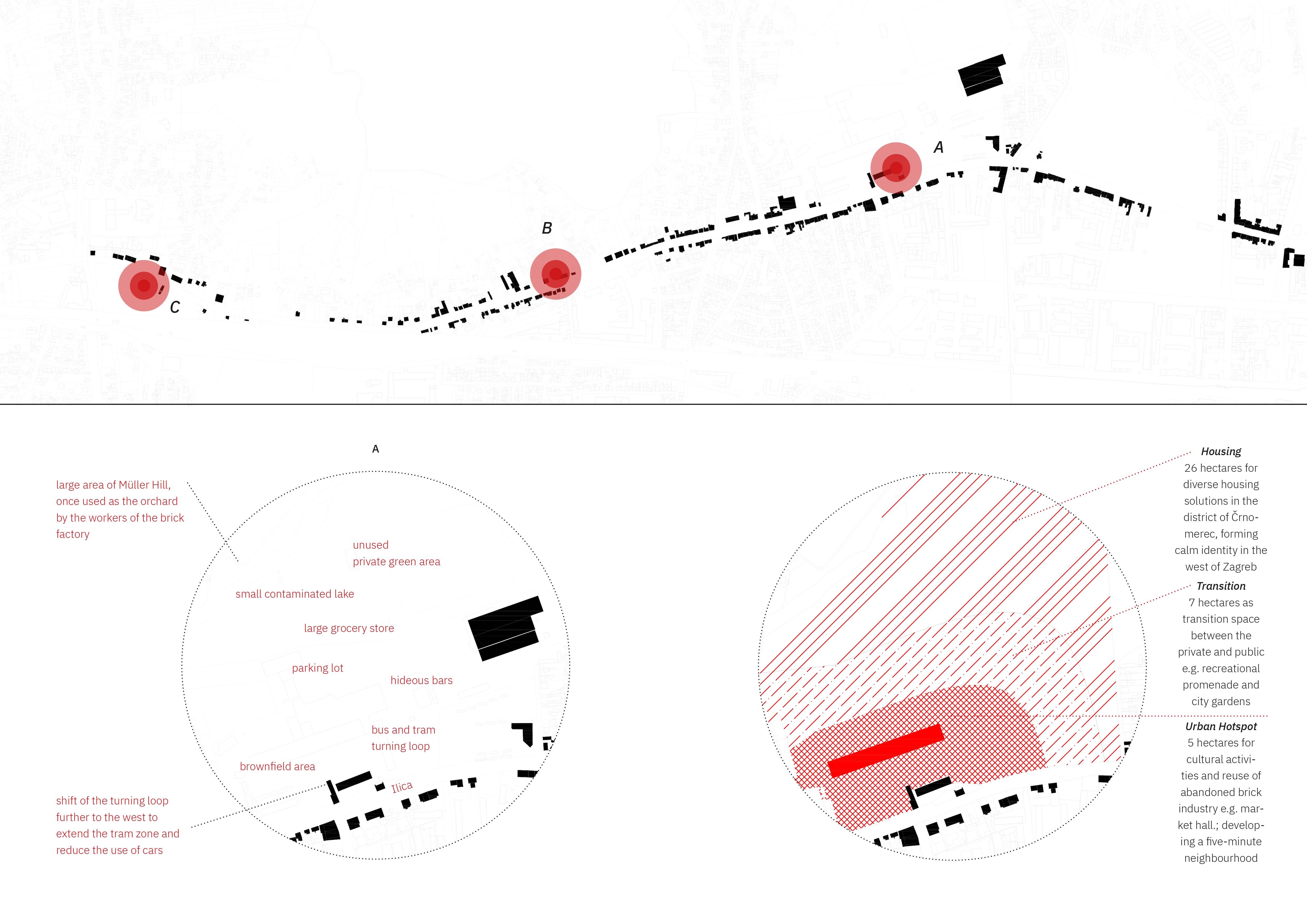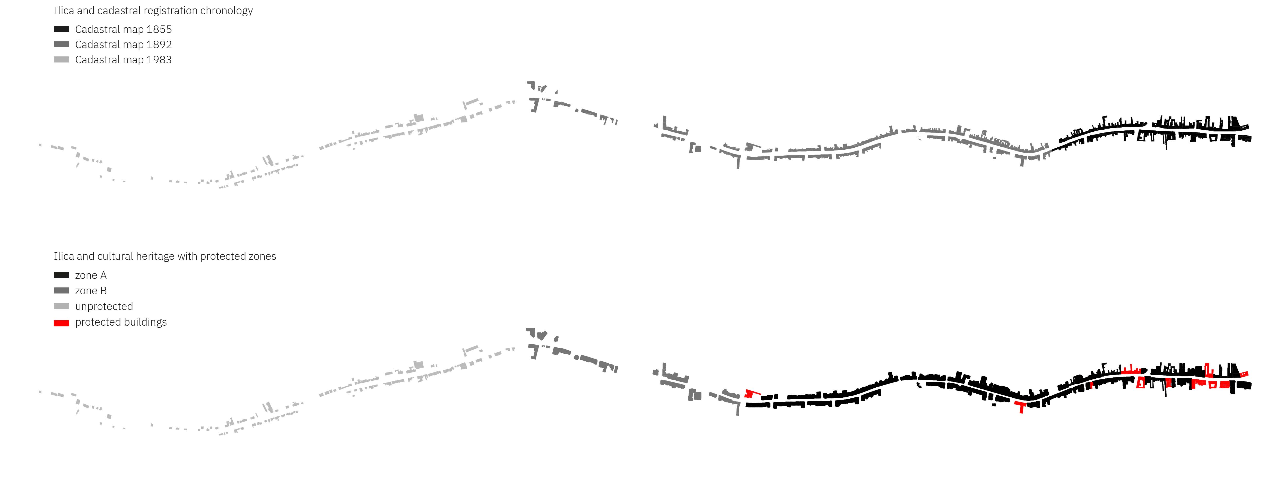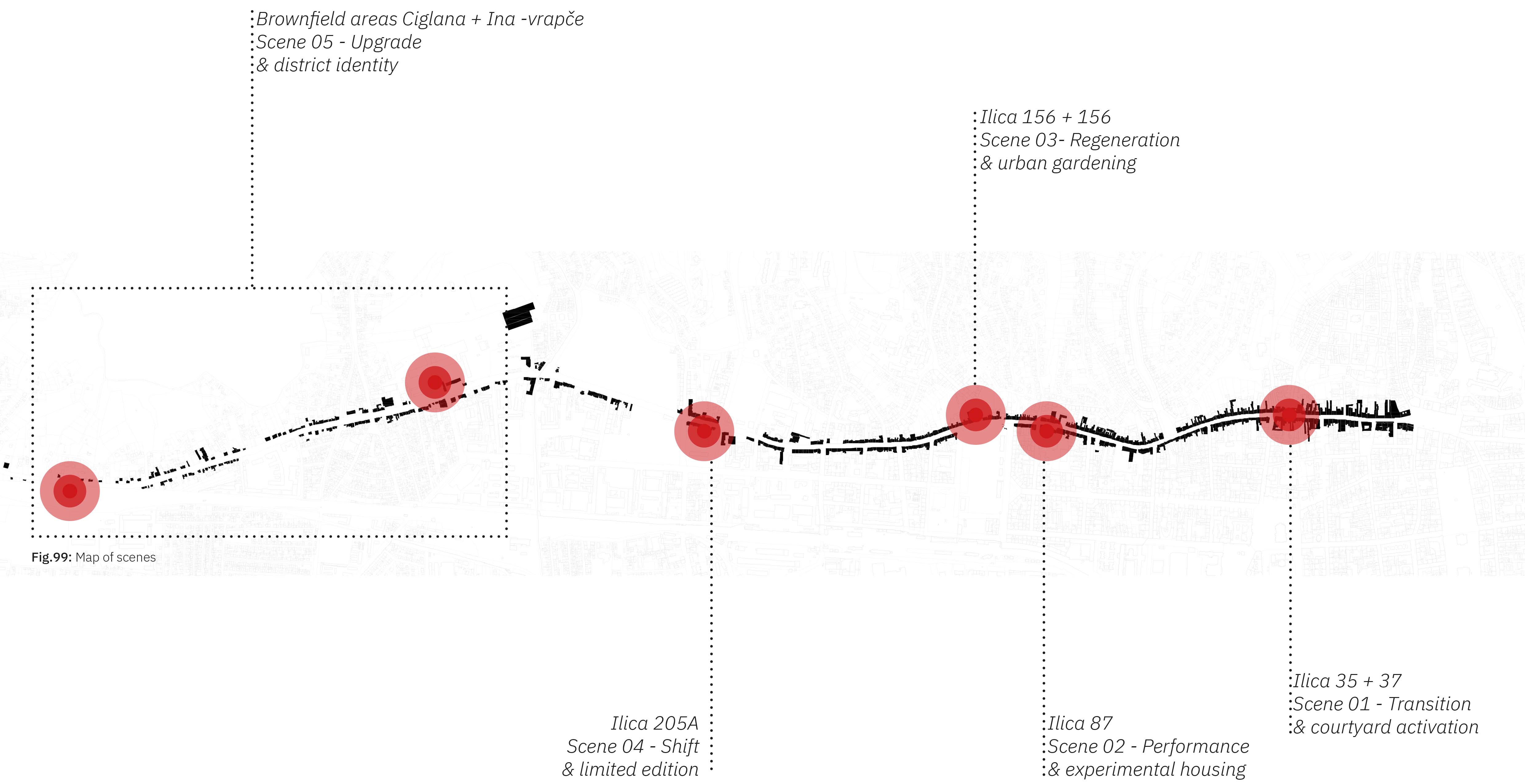 With a length of 5.7 kilometers, Ilica is Zagreb’s third longest street. It is a street full of stories and historical influences that are reshaping the form and exchanges between several stages of a very dynamic life. Despite being the primary cause of morning traffic jams, Illica serves as the main connector between the western and eastern parts of the city. The city blocks closer to the city center are in better shape, and at ground floor level they brim with life, contributing to a buzzy street atmosphere. The situation changes rapidly after one kilometer, many ground floors are vacant, and there is a changing typology of unused spaces that are aesthetically pleasing but act strangely. There is no space for bikes, sidewalks are narrower, and cars replace trams in areas that could be reserved for other users. This project aims to go more deeply into the street’s history and morphology as well as the street level environment. What is Ilica telling us? How did things come to be the way they are? Since each zone requires a different approach, the primary focus is on the different sequences and elements of Ilica. While in one zone we deal with the problem of undefined urban voids that appear like urban mutants, in another we look at vacancies that have potential as social spaces and a street-level environment for healthy activities, something that is lacking at present. Following the collection and analysis of data, the project concentrates on establishing a proper connection across various scales.Alle hier hochgeladenen Inhalte sind das eigene Werk der Absolventin oder des Absolventen.