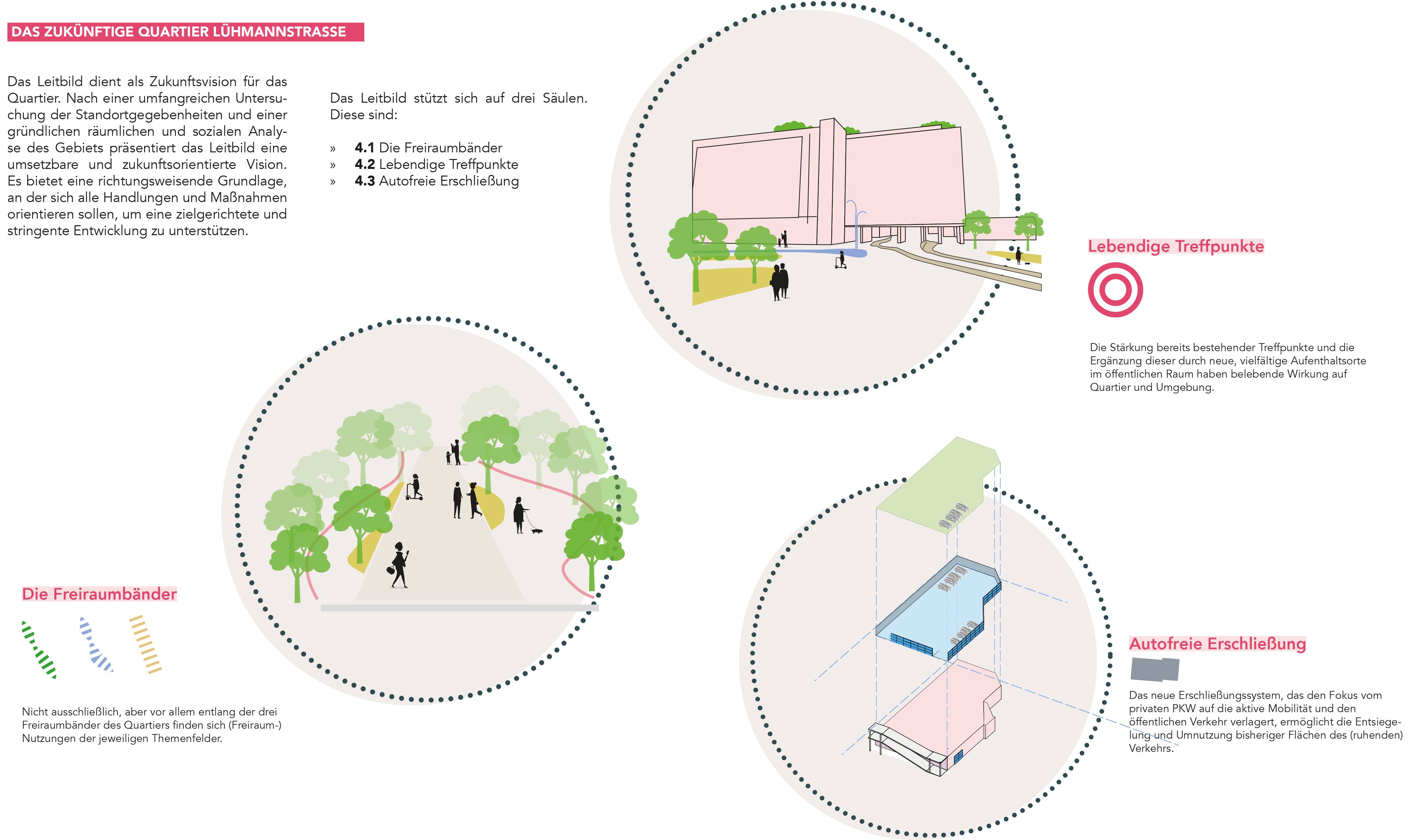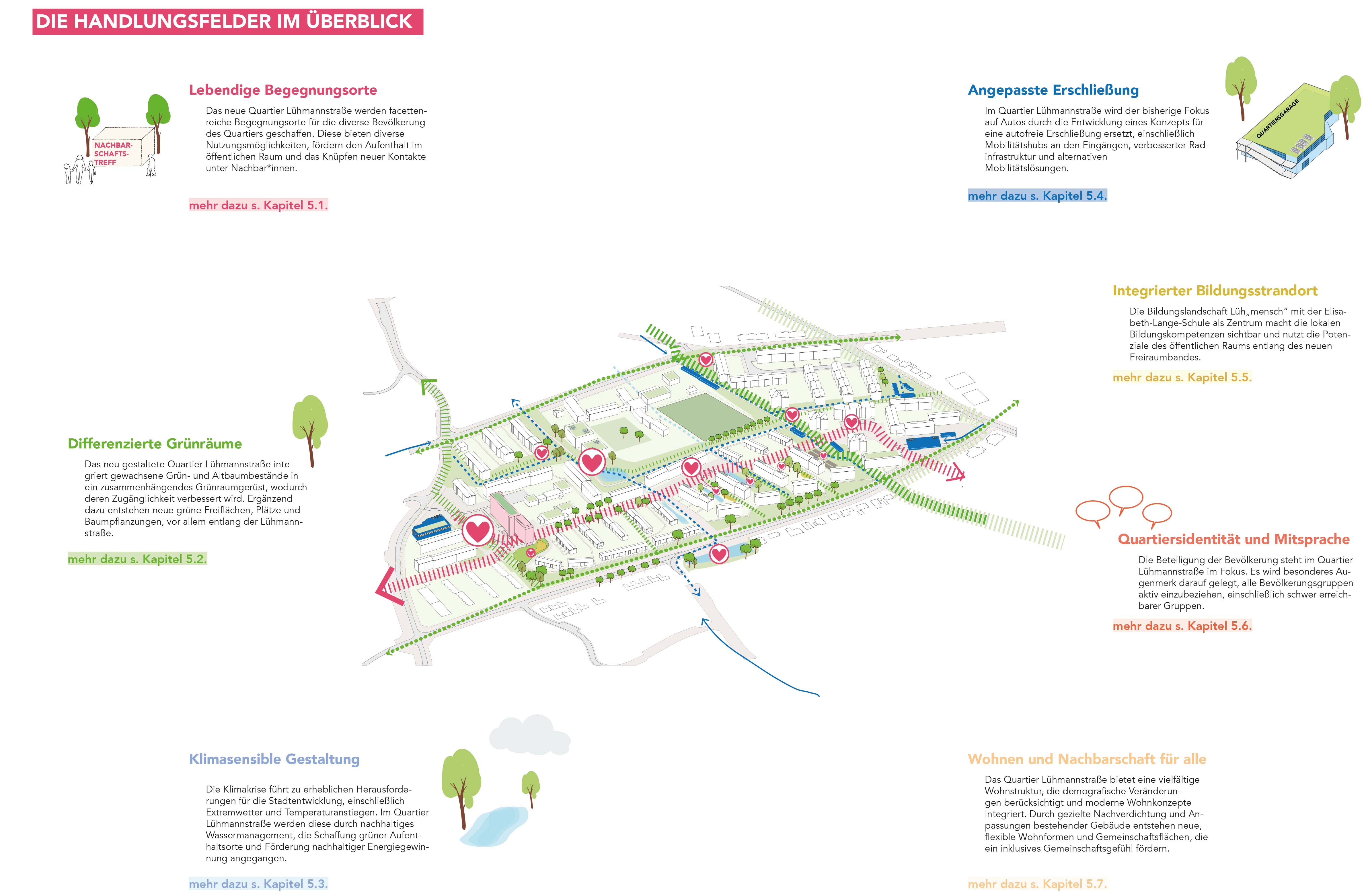 Die Diplomarbeit fokussiert auf die Entwicklung des Quartiers Lühmannstraße in Hamburg-Eißendorf. Mit dem Instrument der „Integrierten Entwicklungsplanung“ wird die Transformation der Bestandssiedlung der Nachkriegszeit zu einem lebendigen und zukunftsorientierten Quartier untersucht und ein umfassendes und nachvollziehbar argumentiertes räumliches Entwicklungskonzept ausgearbeitet. Im Zentrum stehen Handlungsfelder und Maßnahmen in der Neustrukturierung und Attraktivierung der Freiräume ebenso wie Maßnahmen zur Förderung der aktiven Mobilität und des öffentlichen Verkehrs. Ein wichtiger Aspekt ist die Auseinandersetzung mit den Herausforderungen einer klimasensiblen Gestaltung und der Integration der Bildungsstandorte im Quartier.Alle hier hochgeladenen Inhalte sind das eigene Werk der Absolventin oder des Absolventen.