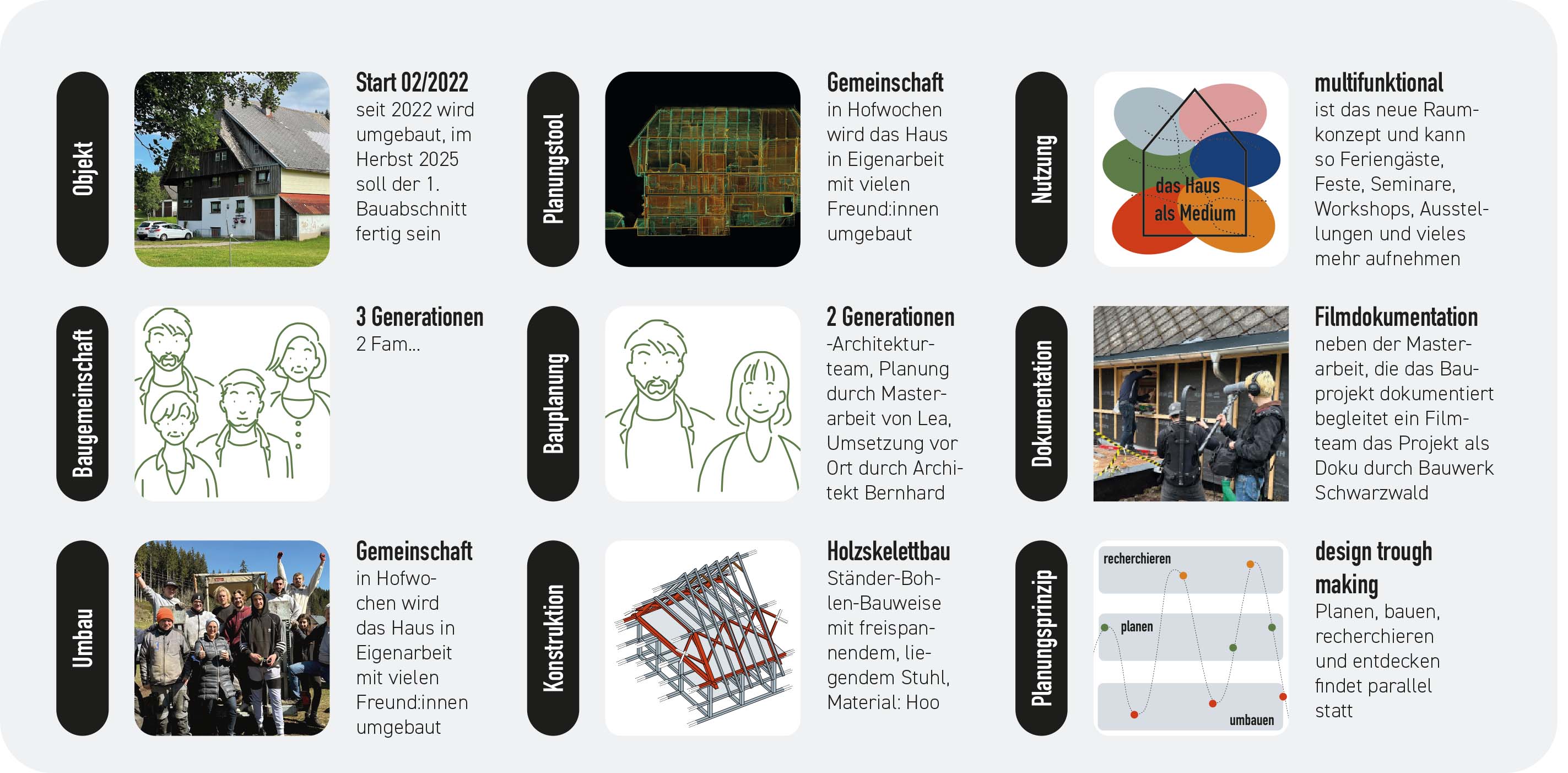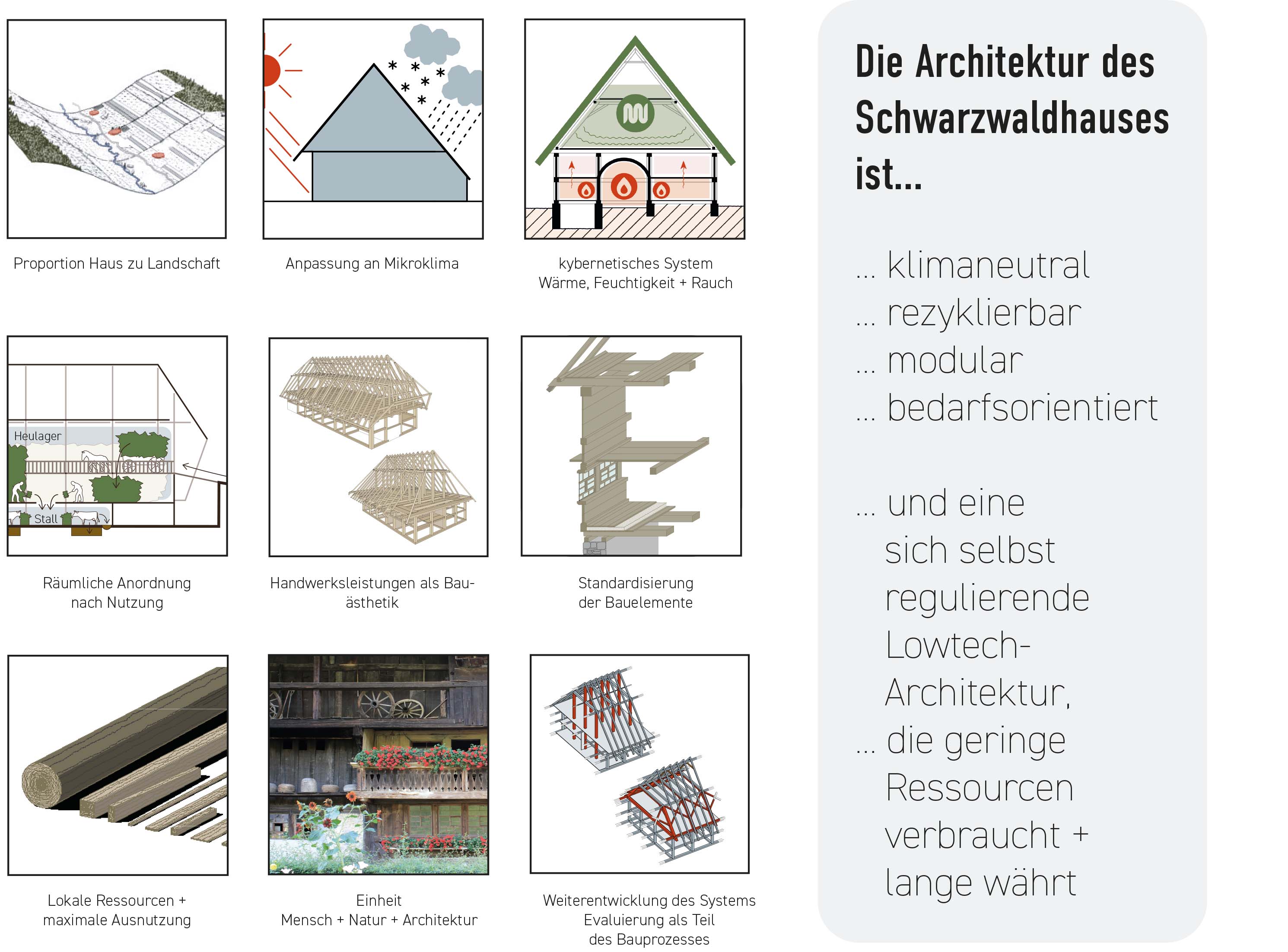 Das Schwarzwaldhaus ist ein herausragendes Beispiel vernakulärer Architektur und ein Meisterwerk europäischer Holzbaukunst. Über Jahrhunderte entwickelte sich der Gebäudetyp unter den klimatischen Bedingungen der Mittelgebirgslandschaft sowie den Arbeits- und Lebensanforderungen der bäuerlichen Gesellschaft. Der daraus hervorgegangene Eindachhof trotzt mit seiner Holzskelettbauweise Orkanen und prägt mit seinem mächtigen Erscheinungsbild die Kulturlandschaft des Schwarzwalds bis heute. Doch durch Funktionsverlust, unsachgemäße Umbauten und mangelnde Wertschätzung ist sein Bestand drastisch geschrumpft und droht zu verschwinden.Die Arbeit analysiert historische Quellen zur Bautypologie des Schwarzwaldhauses und stellt sie erzählerisch in einen Zusammenhang mit der Siedlungs- und Landschaftsgeschichte der Region. In Grundriss- und Tragwerksstudien werden die Haustypen des Schwarzwaldhauses illustrativ aufgearbeitet und einfach erklärt. Aus der Recherchearbeit leiten sich zehn architektonische Prinzipien ab, die die Wirkungs- und Denkweisen der Bauweise erklären und eine Grundlage für Umbau und Weiterentwicklung bilden.Das Entwurfsobjekt ist ein 300 Jahre altes Schwarzwaldhaus, das in den 1970er-Jahren teilweise abgebrochen und durch einen Massivbau ersetzt wurde. Der neue Entwurf verknüpft die historische Holzstruktur mit dem Bestand zu einem Hybrid, der die Stärken beider Bauweisen vereint. Das neue Konzept wird schrittweise in Selbstbauweise und mit lokalen Handwerksfirmen umgesetzt. Die Besonderheit der Arbeit ist der dokumentierte, parallel verlaufende Prozess von Recherche, Entwurf und Umbau. Die Arbeitsweise – „Design through making“ – ist dabei besonders bestandsschonend. Die Arbeit versteht sich als Beitrag zur Bewahrung, Weiterentwicklung und Wiederbelebung einer jahrhundertealten Baukultur und begreift den Entwurfsprozess als Disziplin, die aus tiefem Verständnis für eine Region, ihre Geschichte und ihre Menschen schöpft.Alle hier hochgeladenen Inhalte sind das eigene Werk der Absolventin oder des Absolventen.